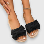 Kényelmes és stílusos lapos szandál, nyitott orral és elegáns masnival. Ideális pihentető nyári napokra és tengerparti látogatásokra.